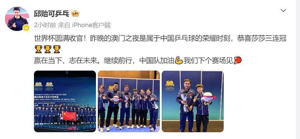 在4月5日进行的2026海外乒联单打寰球杯女单决赛中,中国选手孙颖莎以4:1校服队友王曼昱,杀青该项赛事“三连冠”。4月6日,@孙颖莎 发长文: ![]() 很欢跃能在澳门寰球杯再次拿下冠军。 练习的阵势,练习的氛围,进程跌宕鼎新,每一场球完满力以赴、拼到终末。 得胜从不是一个东说念主的荣誉,而是团队沿途激昂的成果。 感谢中国国度乒乓球队这个伟大的集体,感谢死后一齐赞成我的磨真金不怕火,团队、家东说念主,也谢谢场表里永恒为我加油的球迷一又友。 你们的随同与信任,永远是我最坚实的后援。 寰球杯圆满驱散,有趣永不罢手。 新的挑战如故在路上,我会陆续负重致远、前仆后继。咱们下个赛场见! 之后,孙颖莎的磨真金不怕火邱贻可也在社媒上发文: 寰球杯圆满收官!昨晚的澳门之夜是属于中国乒乓球的荣耀时辰,恭喜莎莎三连冠。赢在当下,志在翌日。陆续前行,中国队加油,咱们下个赛场见。 ![]() 音问开首:@孙颖莎、@邱贻可乒乓 ","del":0,"gnid":"9945c29f2e98710ef","img_data":[{"flag":"2","img":[{"desc":"","height":"692","title":"","url":"http://p0.img.360kuai.com/t11508c75c8075d16e5a1811959.jpg","width":"628"},{"desc":"","height":"449","title":"","url":"http://p0.img.360kuai.com/t11508c75c8571696c498a5baee.jpg","width":"963"}]}],"original":0,"pat":"art_src_3,fts0,sts0","powerby":"cache","pub_time":1775482560000,"pure":"","rawurl":"http://zm.news.so.com/1fc889a6f5ad71b3b521df47a5e1feda","redirect":0,"rptid":"5bc6dff1230e306c","rss_ext":[],"s":"t","src":"上游新闻","tag":[{"clk":"ksport_1:王曼昱","k":"王曼昱","u":""},{"clk":"ksport_1:寰球杯","k":"寰球杯","u":""},{"clk":"ksport_1:中国队","k":"中国队","u":""},{"clk":"ksport_1:孙颖莎","k":"孙颖莎","u":""},{"clk":"ksport_1:乒乓球队","k":"乒乓球队","u":""}],"title":"孙颖莎发长文回归澳门寰球杯","type":"zmt","wapurl":"http://zm.news.so.com/1fc889a6f5ad71b3b521df47a5e1feda","ytag":"体育:乒球","zmt":{"brand":{},"cert":"上游新闻官方账号","desc":"重庆日报报业集团上游新闻","fans_num":5098,"id":"3180115758","is_brand":"0","name":"上游新闻","new_verify":"4","pic":"https://p0.img.360kuai.com/t11508c75c814fd9899d96bd98a.png","real":1,"textimg":"https://p9.img.360kuai.com/bl/0_3/t017c4d51e87f46986f.png","verify":"0"},"zmt_status":0}","errmsg":"","errno":0} |